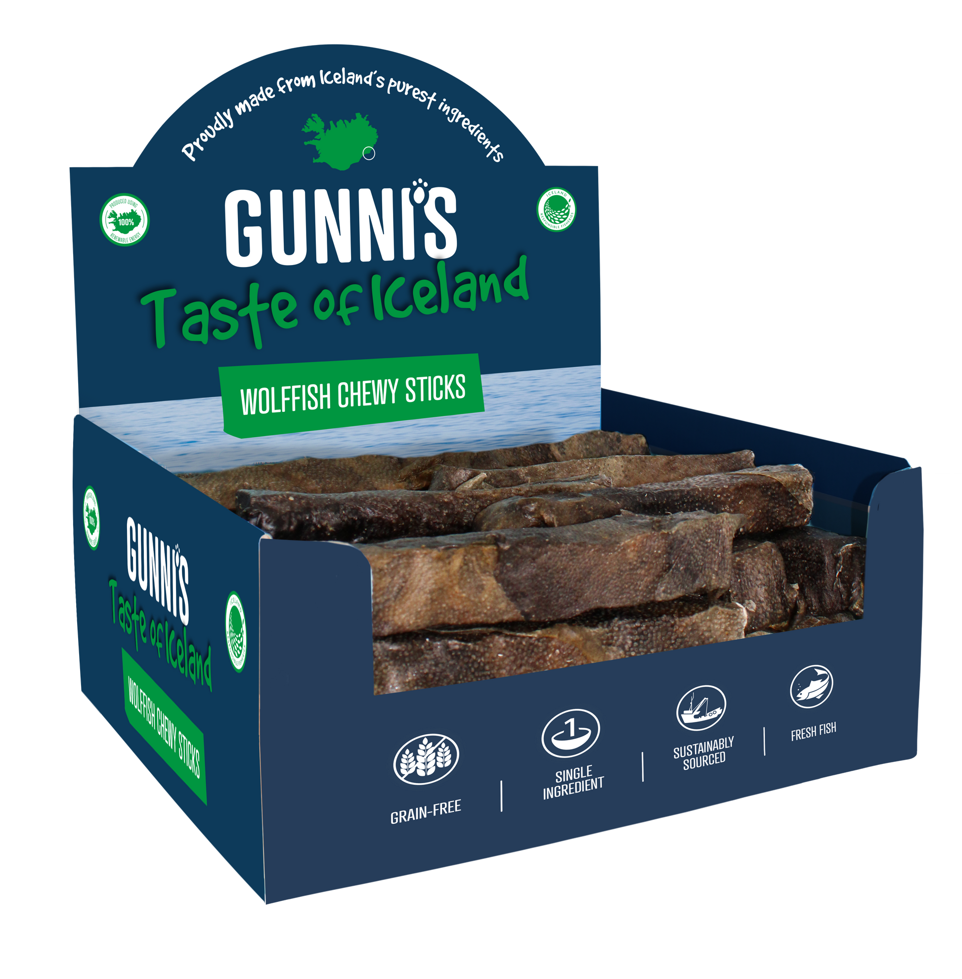 Our Wolffish Chewy Sticks are a unique chewing experience that deliver a protein-rich treat dogs absolutely love! The hand wrapped Wolffish Chewy Sticks are super tasty dog chews made from from 100% Wolffish fish skin. Each Stick is roughly 8" in length and full of flavor that your dog will adore. The Sticks have a rough texture and help to remove tartar from your dog's teeth!