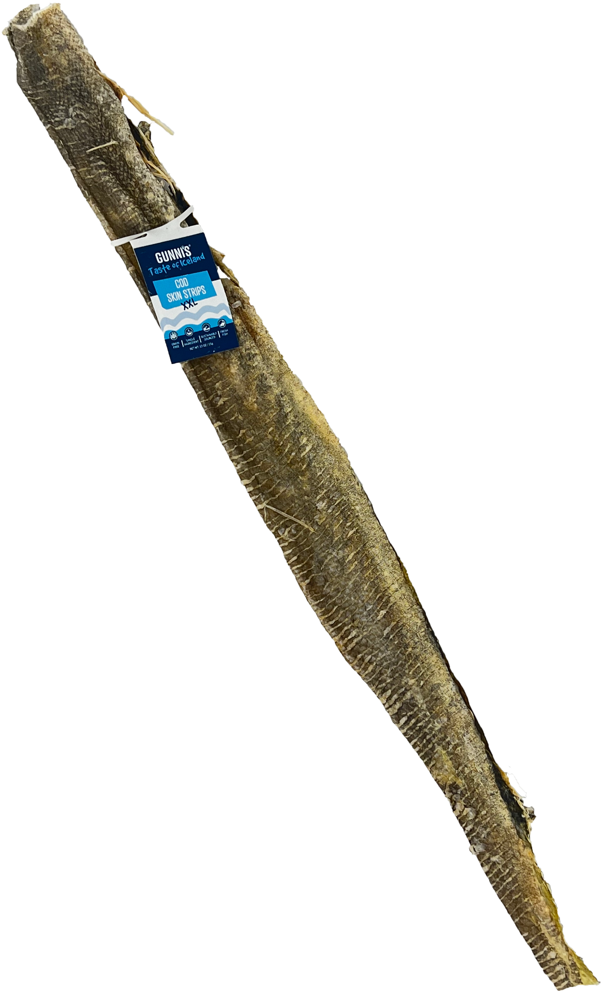 Our 100% natural and edible Icelandic Cod Long Skin Fish Sticks are single ingredient and contain no additives, preservatives or supplements. The Cod Long Skins are 14-17" long.