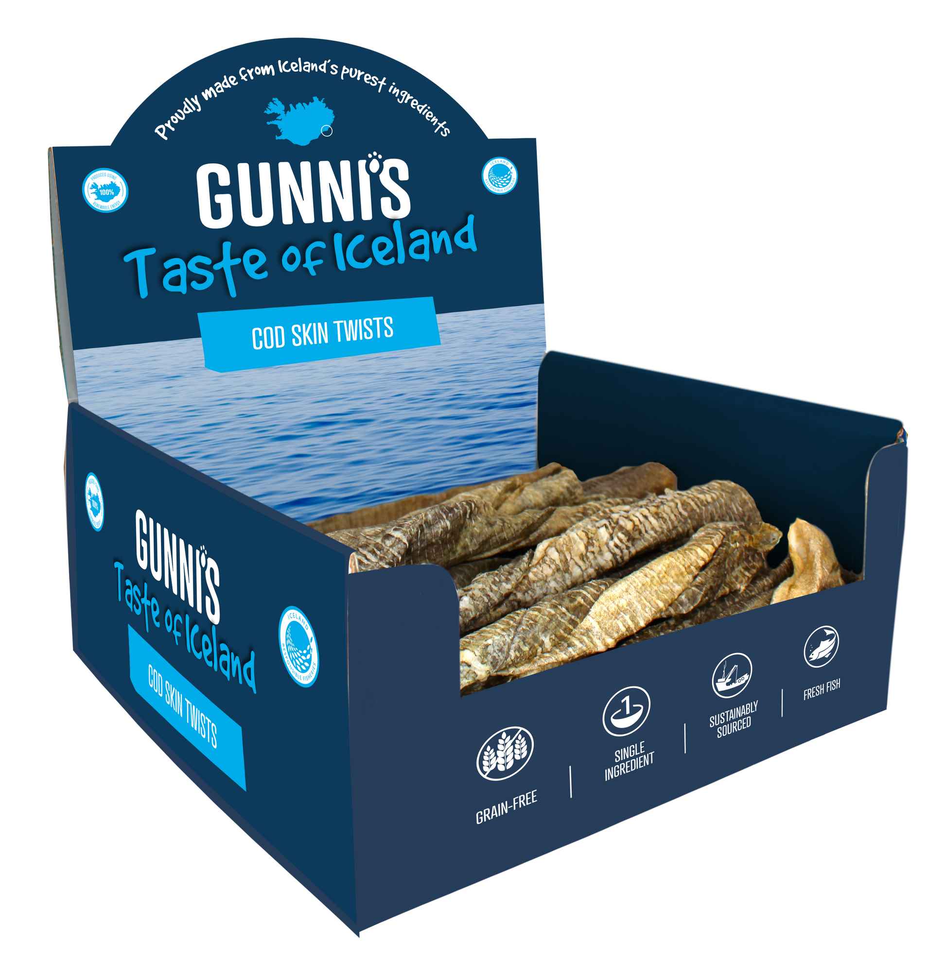 Our Cod Skin Twists are super tasty dog chews made from from 100% cod skin twists. High digestibility and the chewing helps promote healthy teeth and gums. Our Cod Skin Twists deliver a protein-rich chewing experience dogs absolutely love!