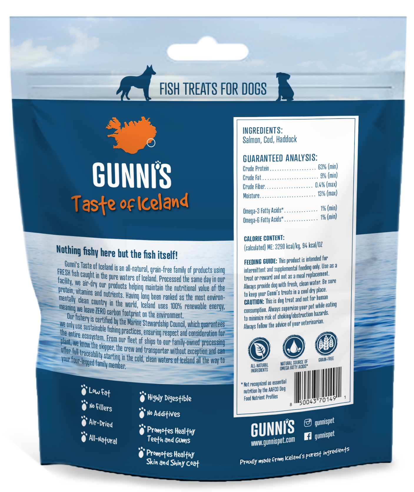 The fish skins are great and so are the salmon rolls both my dogs love them